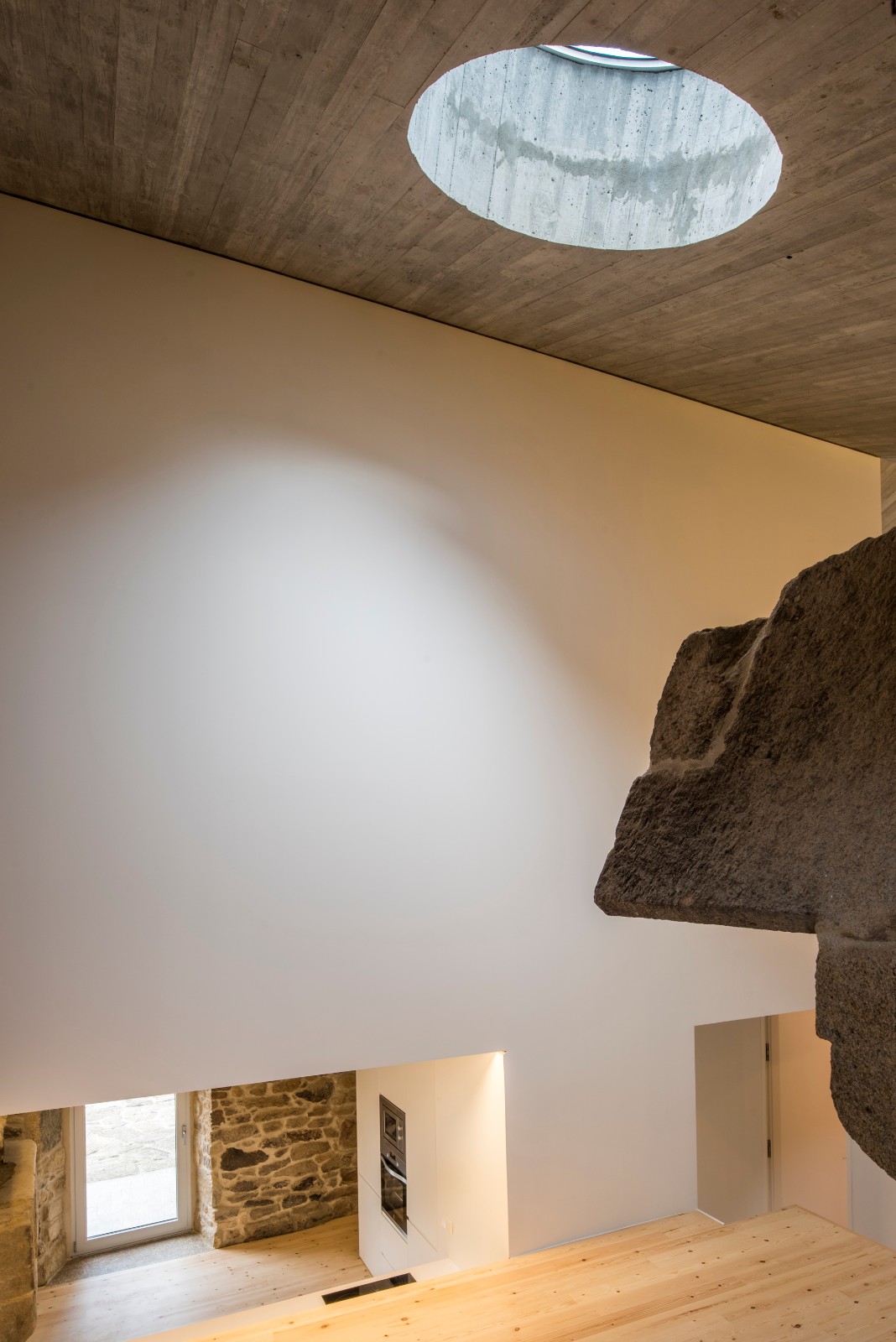 另一个决定是通过加建了三个尺寸不同的天窗,分别位于餐厅,浴室和原马厩位置,使自然光可以进入内部石墙。