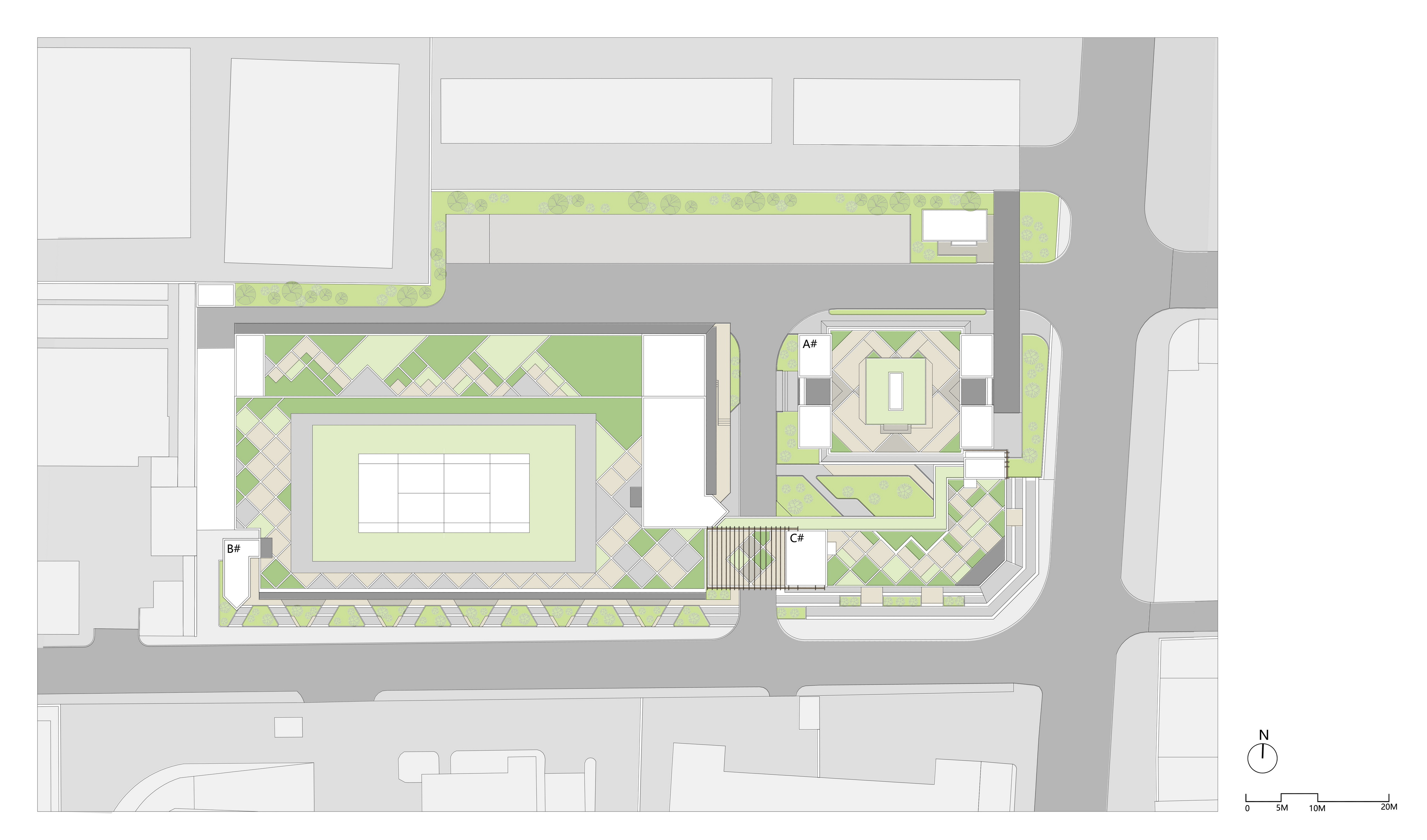 园区原高密度的办公和仓储功能,使之缺乏共享休闲空间。我们联想到西湖风景区以西湖为动线串联各个景点的空间布局规划,决定在不同维度置入不同体量的公共空间,并通过细节处理保证这些空间可见可达。同时也充分利用每栋楼的屋顶区域,根据大小布置空中花园、屋顶运动场等功能模块。