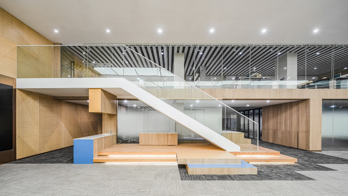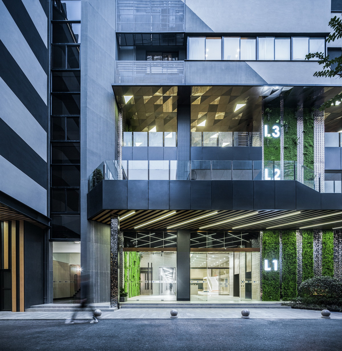 充分研究建筑体量之后,我们决定打开1至3层的电梯厅,增加户外平台作为园区共享会客厅、休闲厅。同时继续运用三角元素,配以彩色不锈钢板、水纹不锈钢板、绿化墙和LED屏,以此实现科技与自然并重。