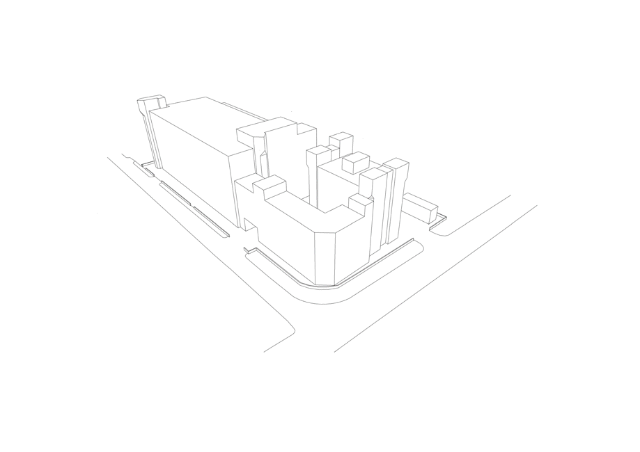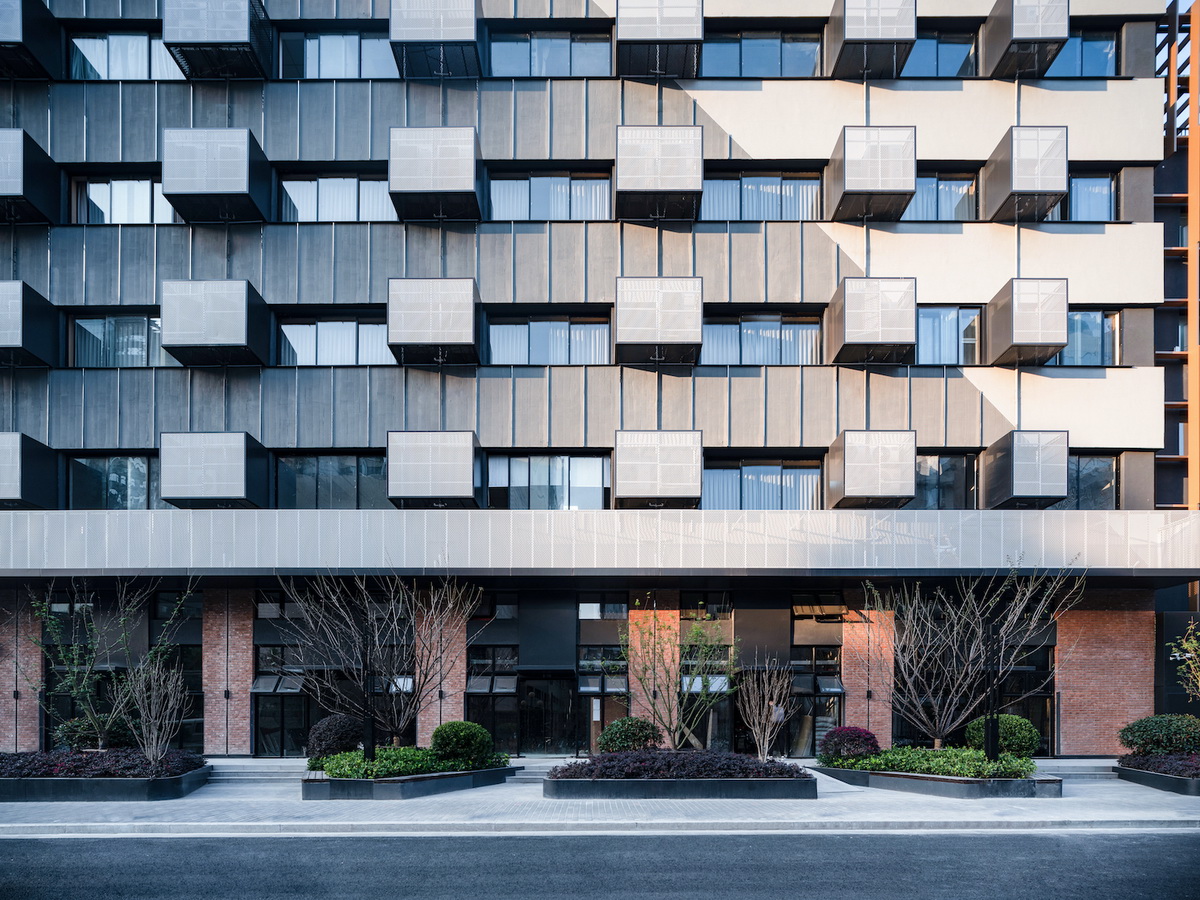 由于项目地处道路交汇处,该处立面就成为了项目沿街展示面的核心部分。我们通过增加造型雨棚、植物墙等手法营造出山峦叠嶂的感觉。即便在很远处,屋顶的绿化墙也能跃入眼中,成为城市天际线中的一点新绿。