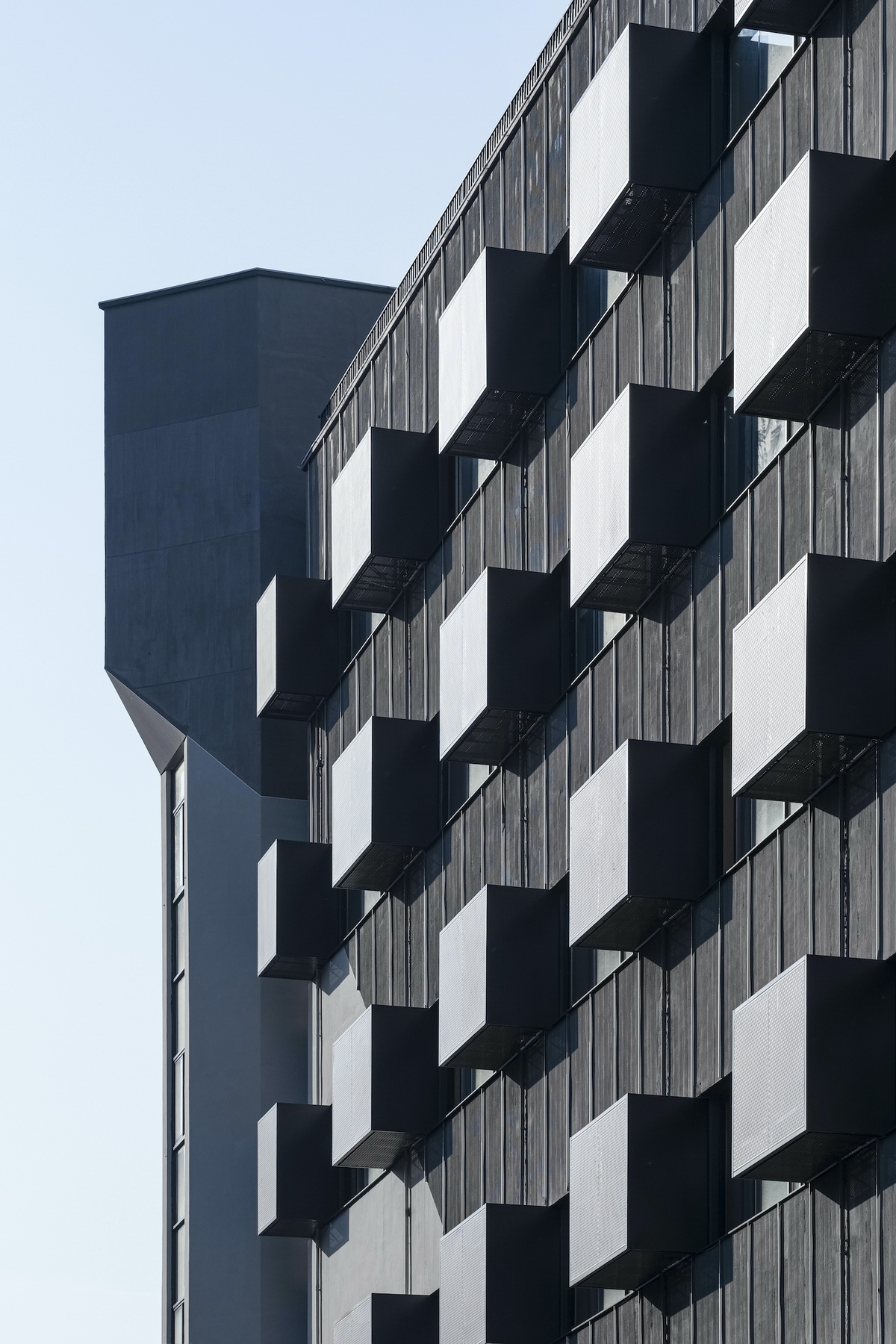 这些三角形大小和夹角各不相同,将它们不断延展并相交后,在建筑立面上形成了犹如联袂山棱的图形,同时也符合基地片区特色。在此基础之上,我们决定以黑白做为项目主色调,点缀以红砖、木纹、绿植,用现代的建造技术在西湖的周边泼墨一幅立体山水画。