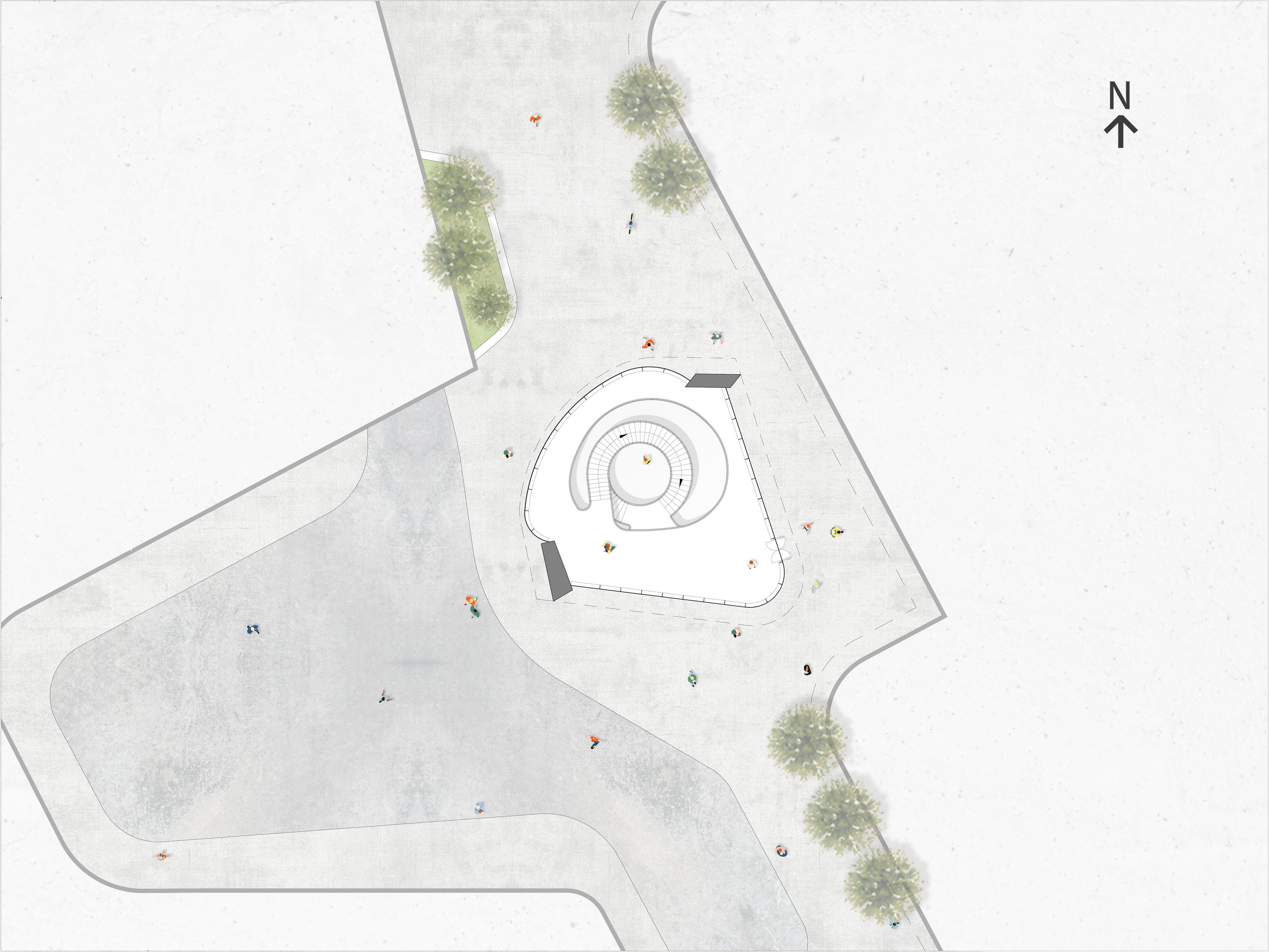 当走进广场时,可见动态的曲线的建筑全貌。设计过程中将最初的多曲面优化成效率更高的单曲面,金属墙体从地面边界生长,滑行路径延伸至屋面,屋面向外延展再向内汇聚,端部指向周边塔楼,加强动态感和整体感。
