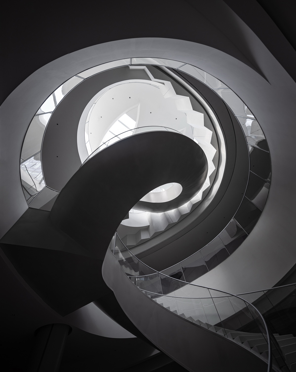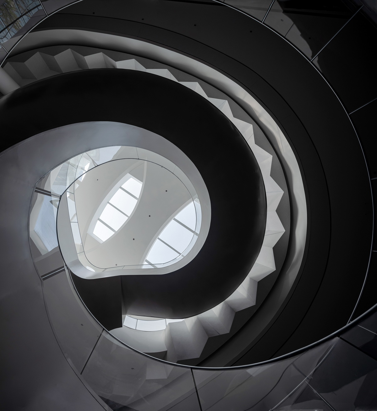 进入建筑后,向内逐渐变亮的天窗、向下倾斜的金属屋面、向里收起的玻璃幕墙,将室外的空间体验带入到建筑内部,形成动态的空间环绕组织,引领参观者走向旋转楼梯,塑造出流动的观览体验。