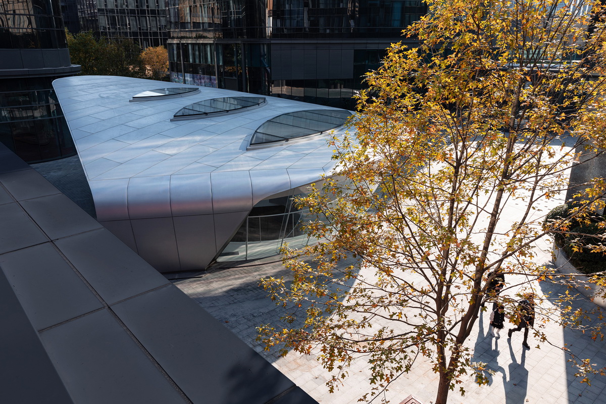 金臣汇商业综合体宽阔的中心广场,和临近航空场地的背景,为上海金臣·亦飞鸣美术馆提供了形体的灵感。