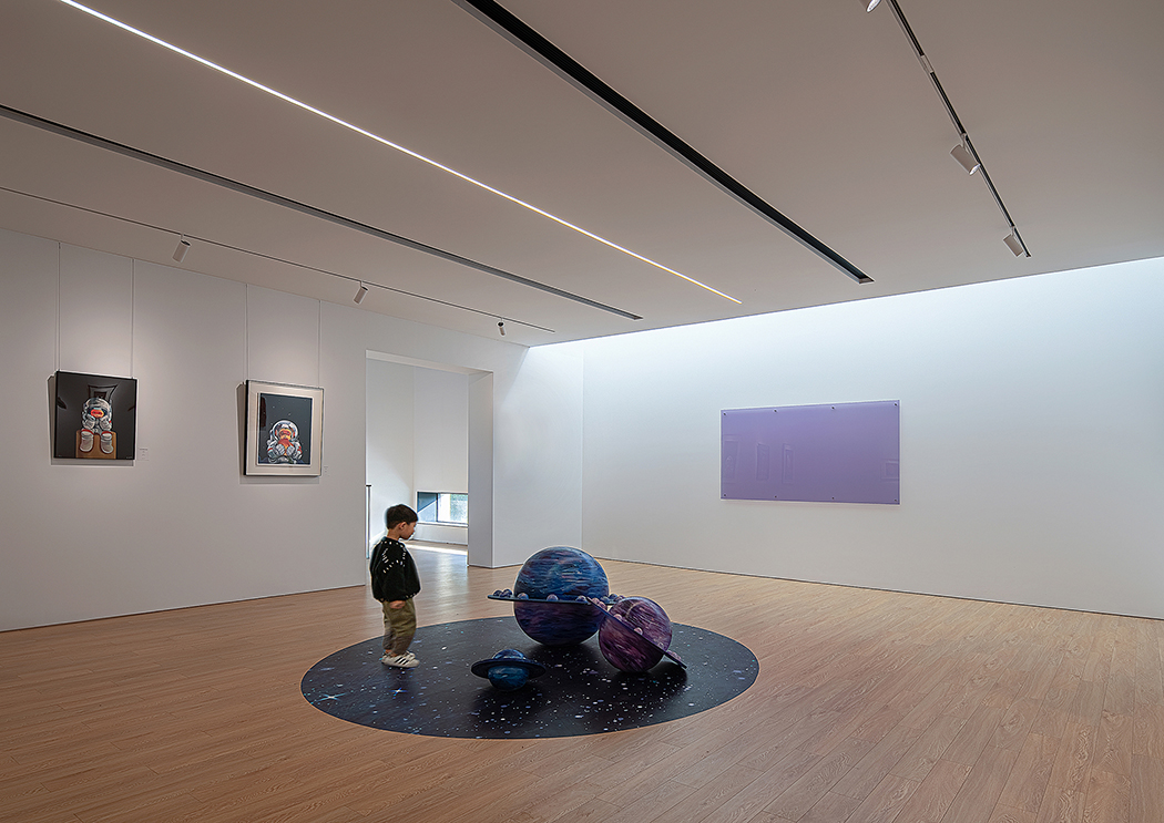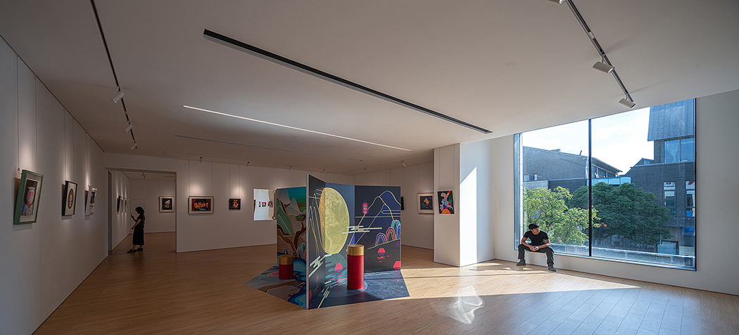 为了能够观展的过程中适度的引入人与外部自然之间的视线连接,也充分的呼应美术馆所在的李公堤的自然景观,设计在部分展厅内置入落地玻璃将更多的自然光线引入展厅空间。大面积的实墙遮挡使光源的强渗透性得以收敛。窗框规范了光落地的范围并将人引导至此驻足停留、嬉戏玩耍。