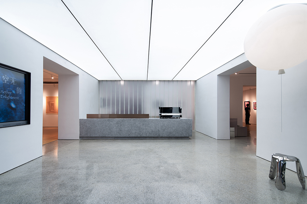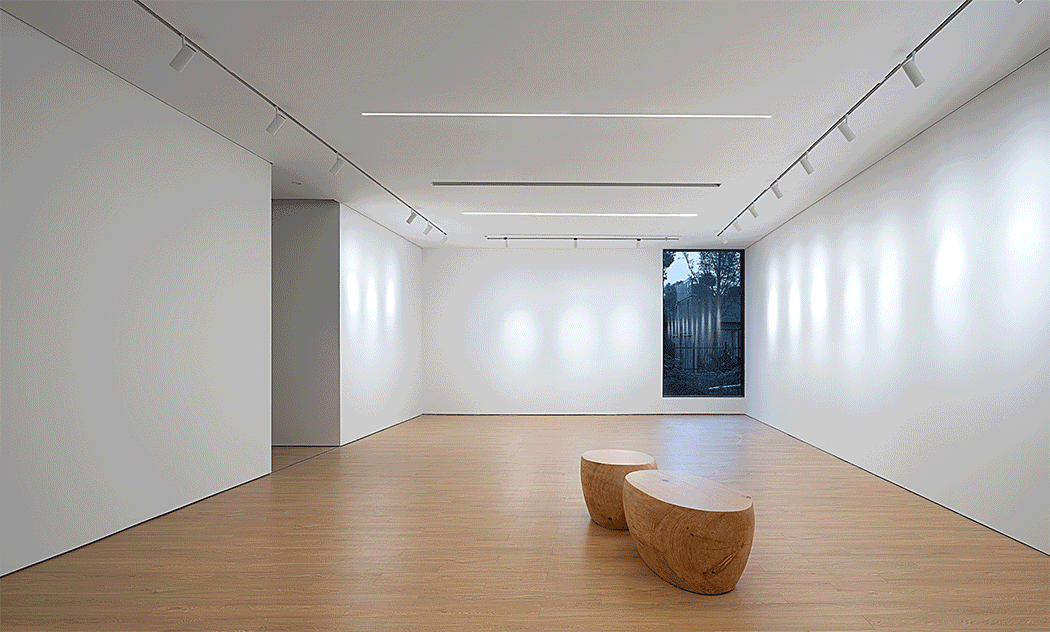 二层西侧的半通高侧庭使光线经过天窗渗透到室内,产生的光影与纯白墙面形成强烈的对比,仿佛在展厅内置入了一个流动的“光体块”。时间的变化为光影带来无限可能,打破了空间的定格,为空间创造了深度。当人们置身展厅在艺术品前或省思或交流的时候,光线似乎与时光一起始料不及的流过。