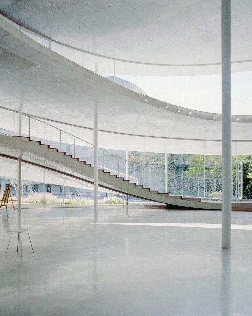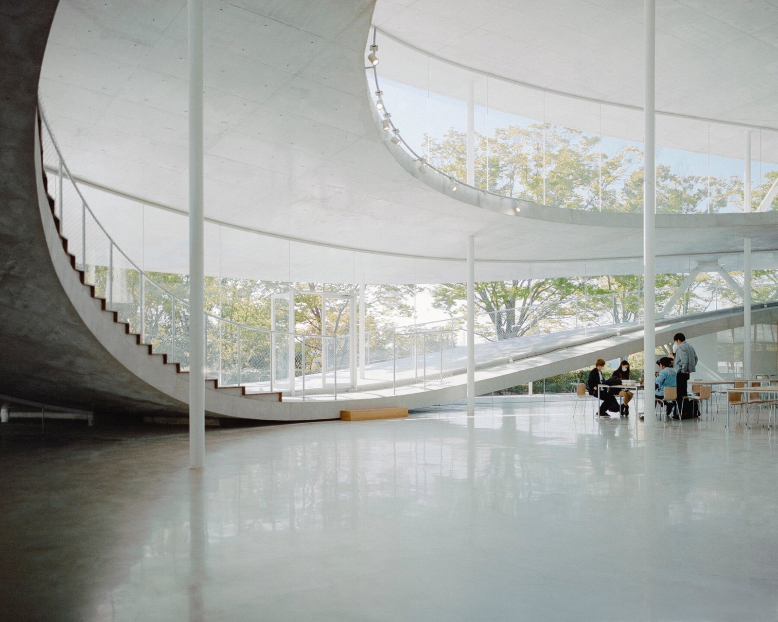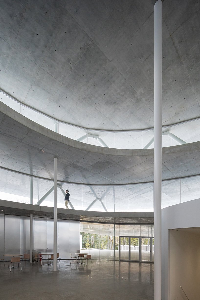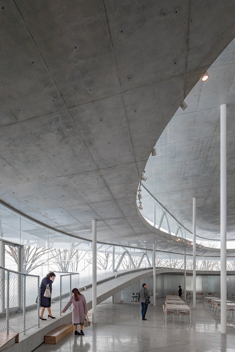 西泽立卫将混凝土和玻璃建筑轻轻地放置在大阪艺术大学校园的弧形场地上。他设计了由起伏的混凝土天篷组成的三层屋顶。
