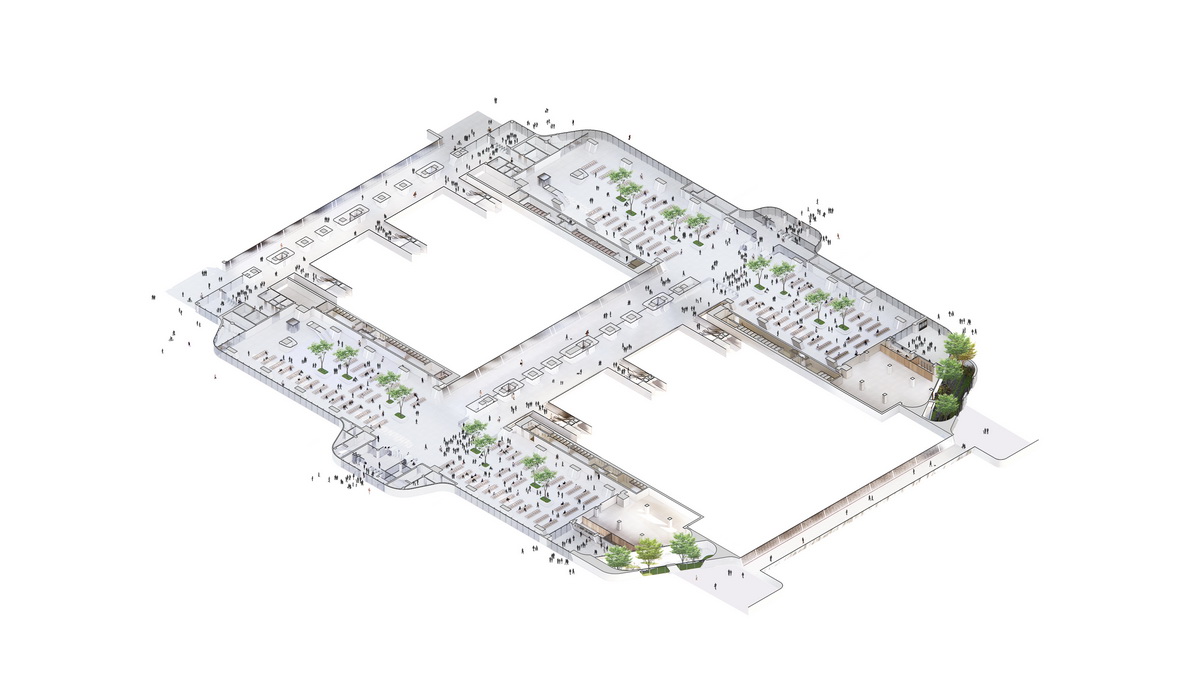 MAD将站前商业也布置在地下,与火车站和市内交通枢纽直接连接,并且通过下沉庭院与地面上公园垂直连通。火车站南侧是新建地上商业空间,建筑围合的草坪成为新的公共空间,可举办音乐会、艺术节、惠民市集等多样室外活动。