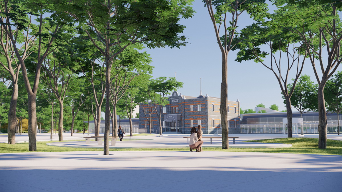 从公园沿着中轴线向南,可以看到复建的老站房与新站房的“漂浮”金属屋顶在树林间若隐若现。新站房进出站平台和候车大厅都在地下,地上仅一层高度,尊重老站房的尺度,并谦虚呼应。
