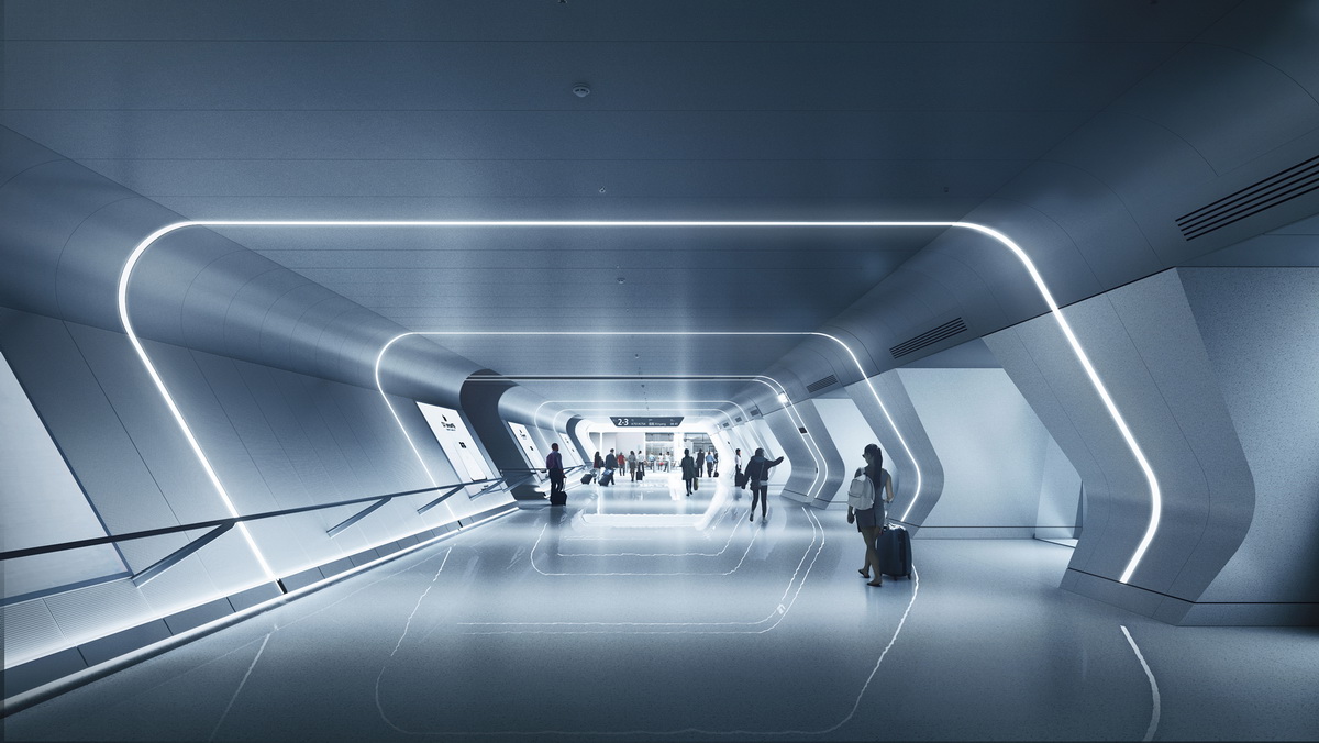 △火车站的进站通道材料简洁,极具未来感