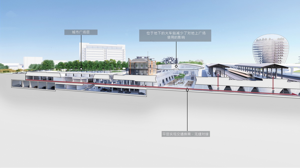 △ 通过将交通和功能放置在地下,解放了地面空间,成为公园。市政道路、城市交通枢纽、火车站和商业平层相连,无缝连接,便捷高效