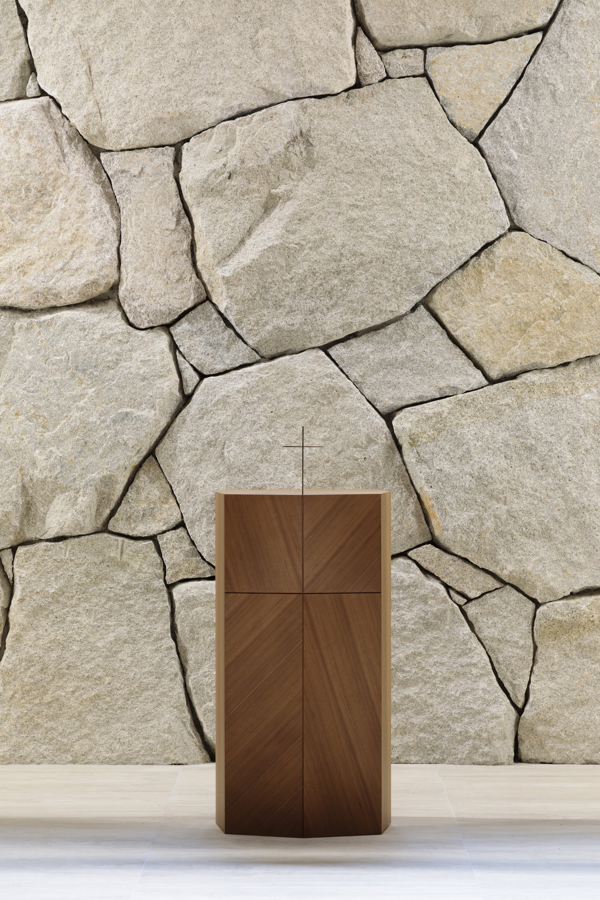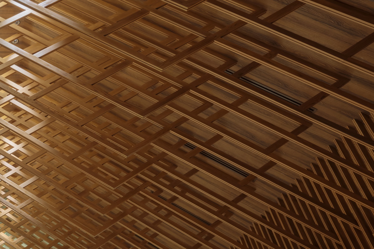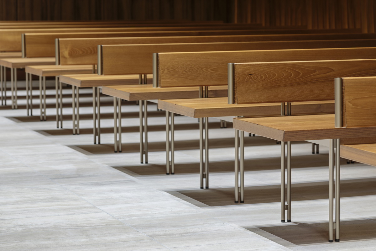 墙上的木制百叶窗创造了深度感和韵律感,向上与网格状的天花板相连,营造了空间整体感,又保证了高质感和一座小教堂应具有的平静祥和的氛围。