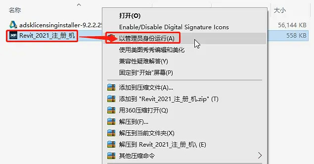 25、回到Revit2021注册机的文件夹内,找到注册机,用鼠标右键单击Revit2021注册机,点以管理员身份运行;