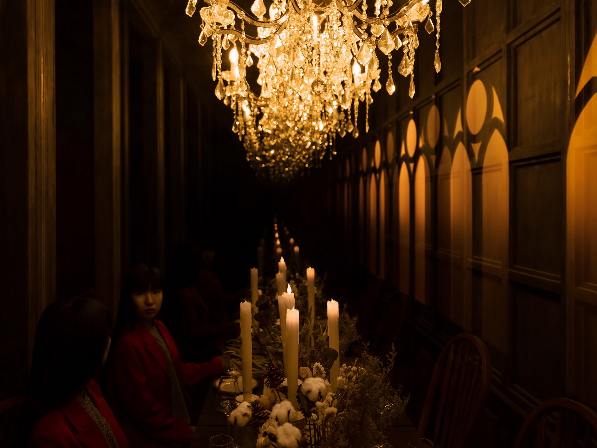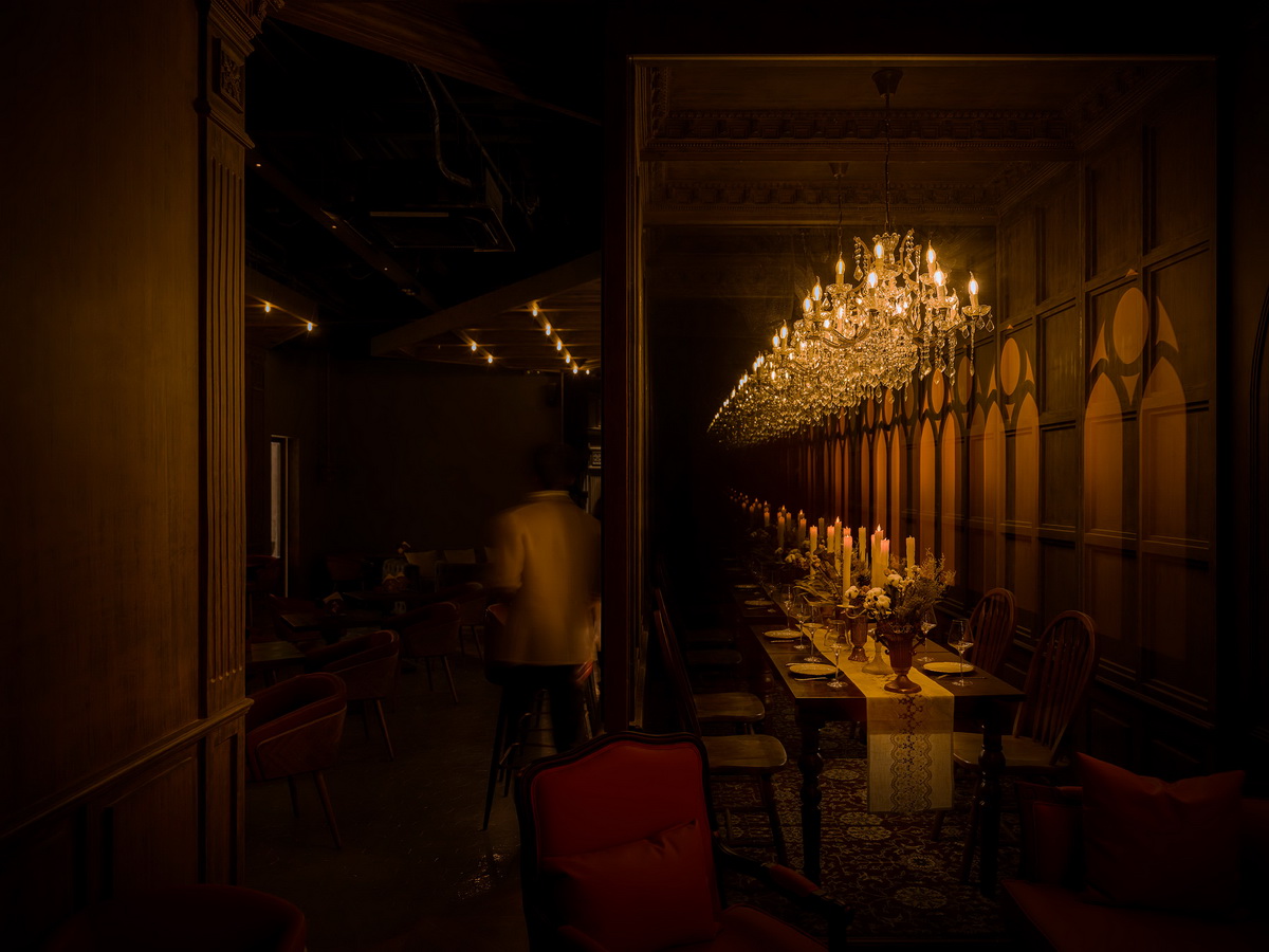 主入口进门之后看到无穷尽的餐厅场景的反射装置,餐桌的布置可以通过开敞的窗口来随时更换,结合不同的节日或故事内容,可更替内容的装置使空间更加的真实。