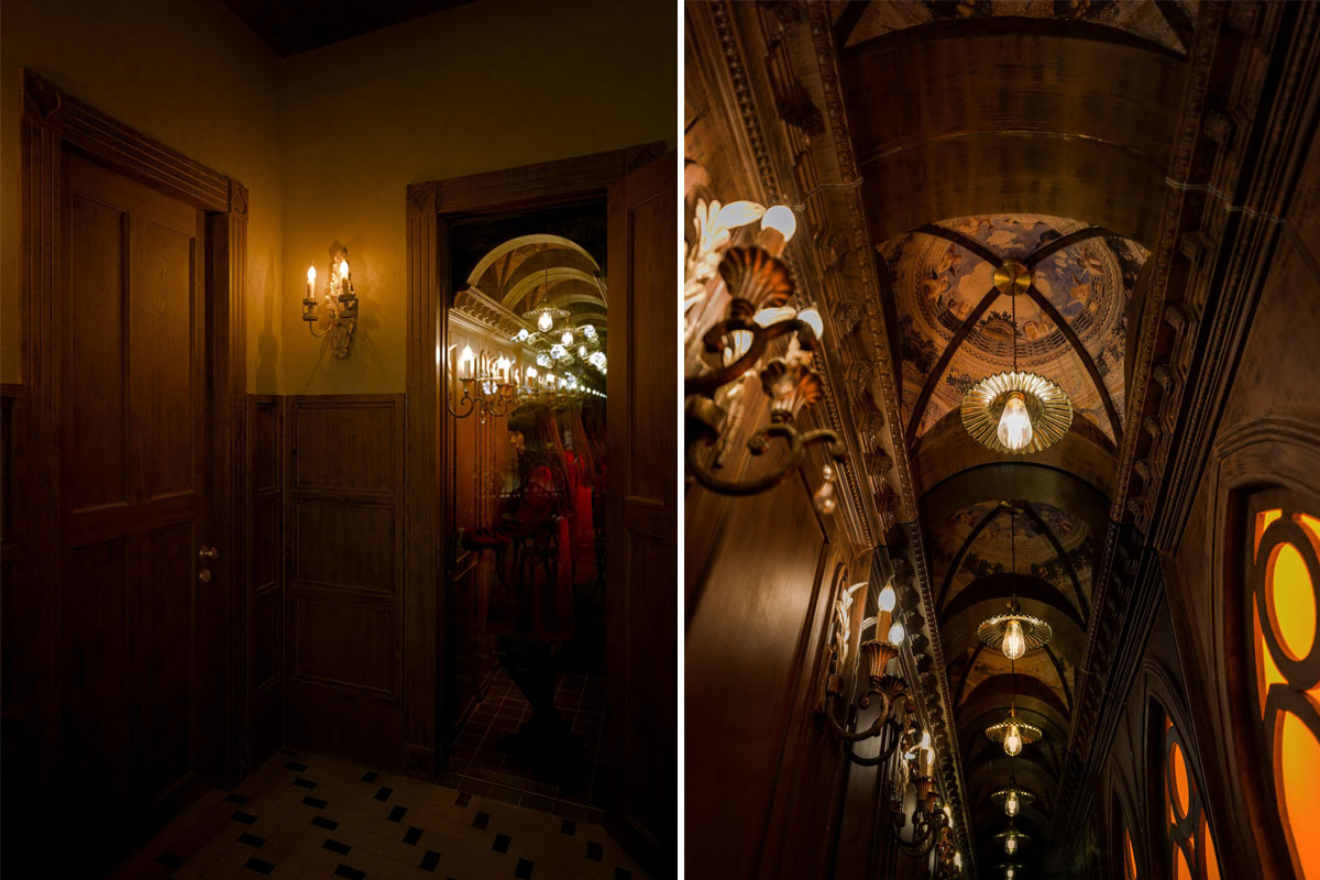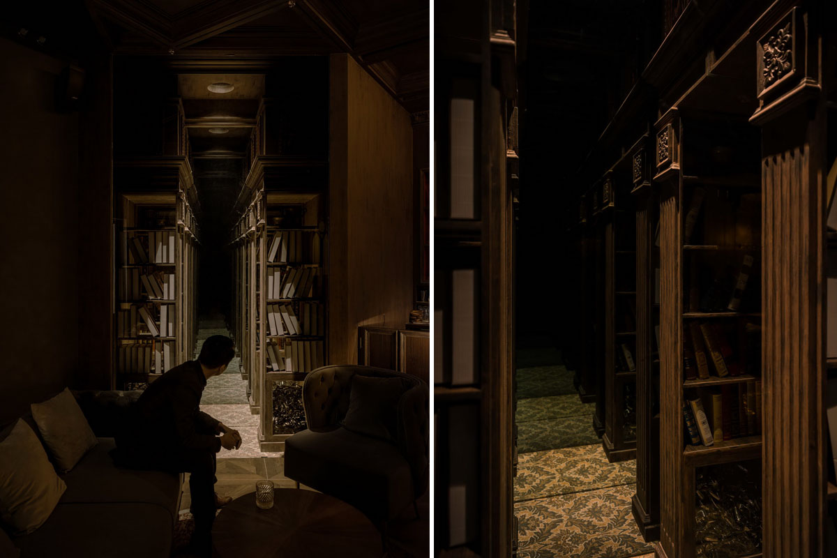 空间中的场景主要分为外立面的走廊场景;玄关处的餐厅场景;吧台处的客厅场景和表演区的书房场景。设计师在每个场景处设计了反射装置,利用镜面与单反镜面打造了具有无限延伸效果的餐厅、书房、走廊场景,这些反射装置中的场景强化了每个空间的功能,也增强了魔法世界主题的氛围。