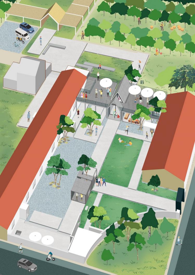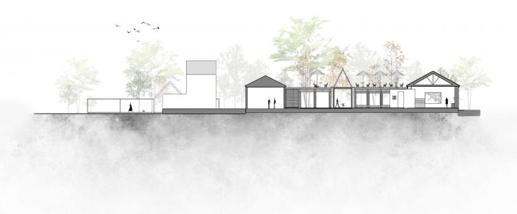 用建筑插件介入,与新建筑、老建筑、光线、树木联系在一起,建筑和景观融合,创造出让人愿意长久驻留的空间。