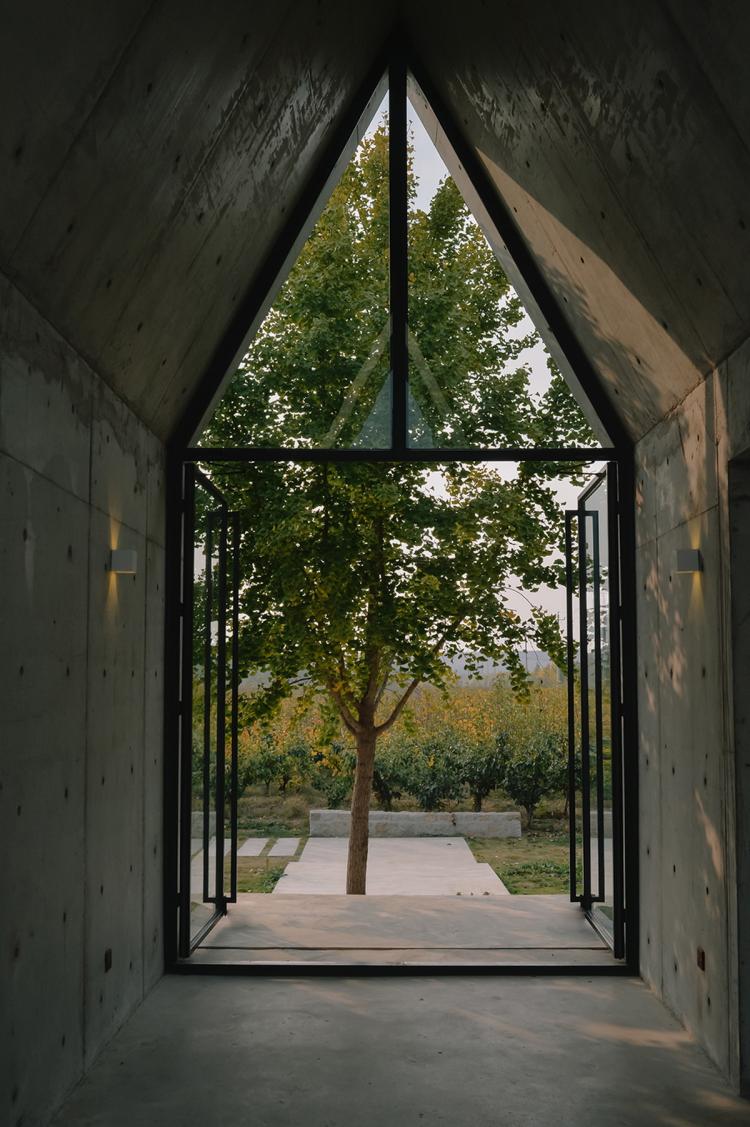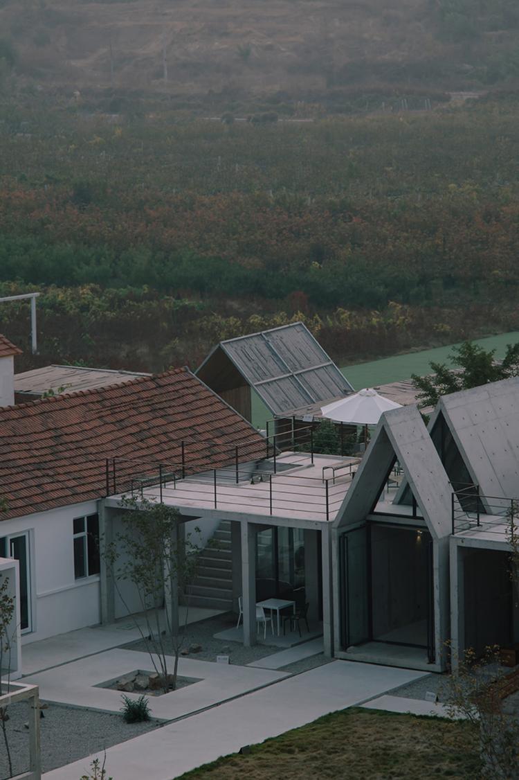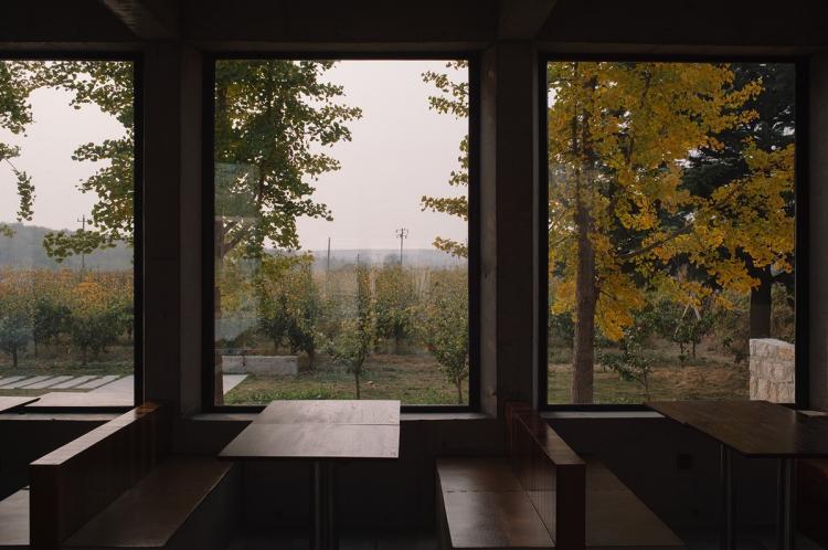 该项目位于烟台莱山镇崖前村永智农场,场地是农场内户粒咖啡的二期项目,改造前是已经闲置的院落,场地东侧是农场的梨园,靠近场地边缘有几棵大银杏树,再远处是连绵的远山,有很美的落日和大片的绿意,如何尊重每一份自然的特性,透过建筑更好的感受到自然,处理好自然、建筑、人的关系成为设计的核心。