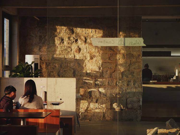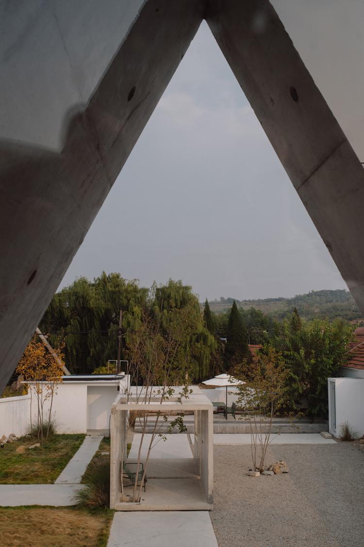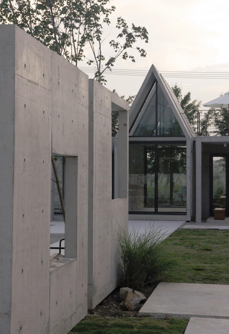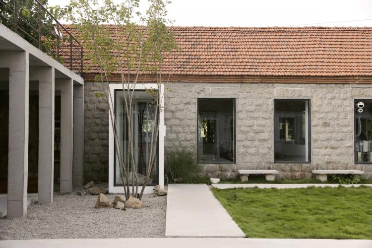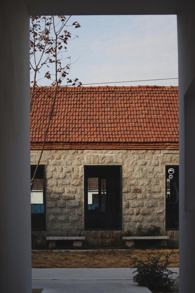 场地北面是一直在运营的户粒咖啡一期,一排红瓦屋顶的砖瓦房,东面也是一样结构的房子,南面是石头外墙的老建筑,和西面的院墙共同围合成一个封闭的院落,改造前已经闲置多年。重新对场地进行动线规划,空间用途梳理。老建筑修旧如旧,新建筑用清水混凝土作为主要材料,混凝土自然的质感可以更好的融入环境。