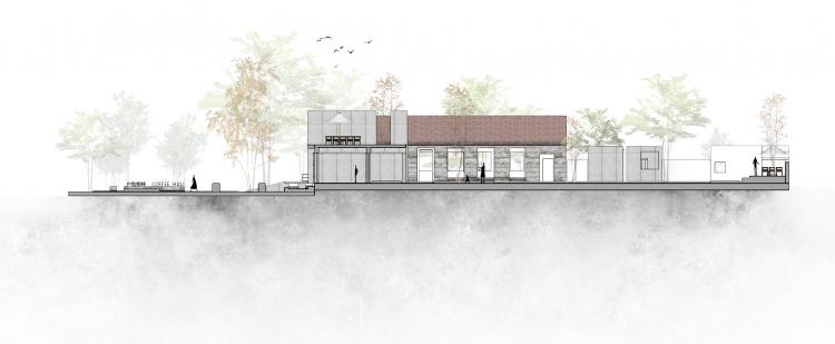 植入新的建筑,使之适应新的使用功能,新建筑将作为主入口通道和客座区的功能使用。新建筑采用清水混凝土和大面积玻璃,以更开放透明的形式介入,让自然能够渗透进入整个院落,与院内景观融为一体。