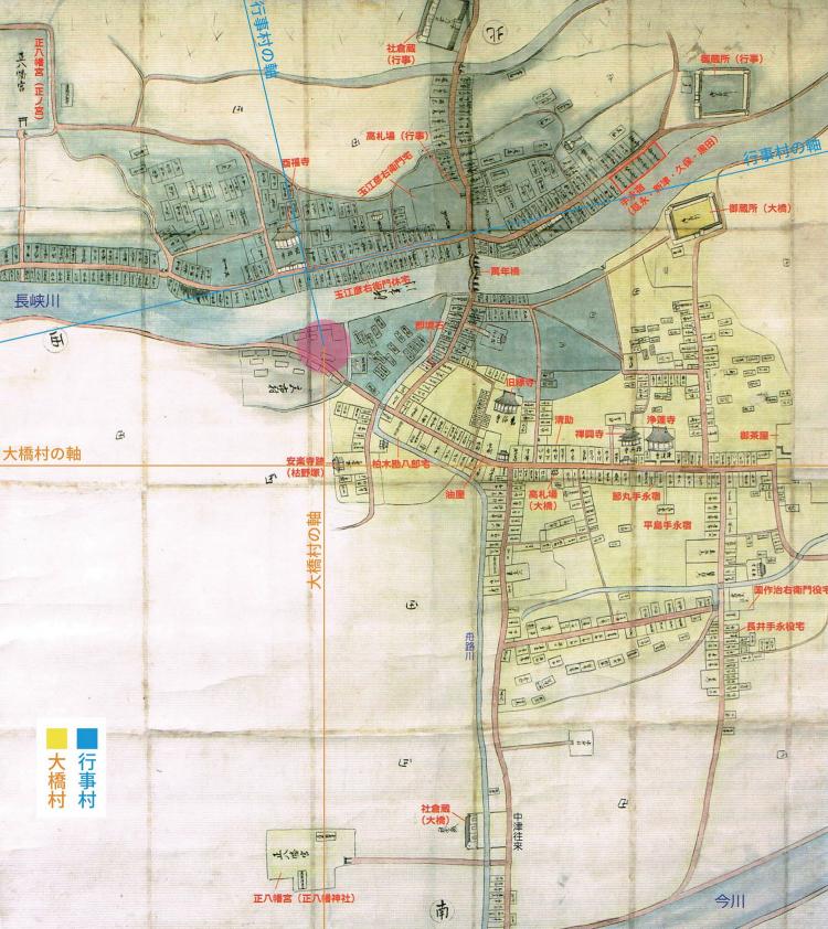 此建筑用地位于流经两村边界的长峡河右岸,在这里,原百三十银行与木蜡商柏谷代代相传的柏木勘八郎的旧居相望而建,历史源远流长。