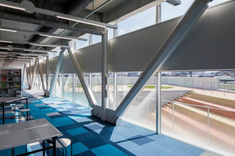 我们将此拥有4层楼的建筑又分为下层和上层两部分,并于中间进行了扭转。下层正对历史建筑红砖馆。我们在尊重这里原本为两地区的历史关系的同时,将此设施背后的原大桥村的城镇布局整合起来,以起到迎接新市民,创造城市新活力的目的。建筑上层则面对长峡河。这样一来,从楼上放眼望去的景观亦是与河对岸的原行事村街景相辅相成。
