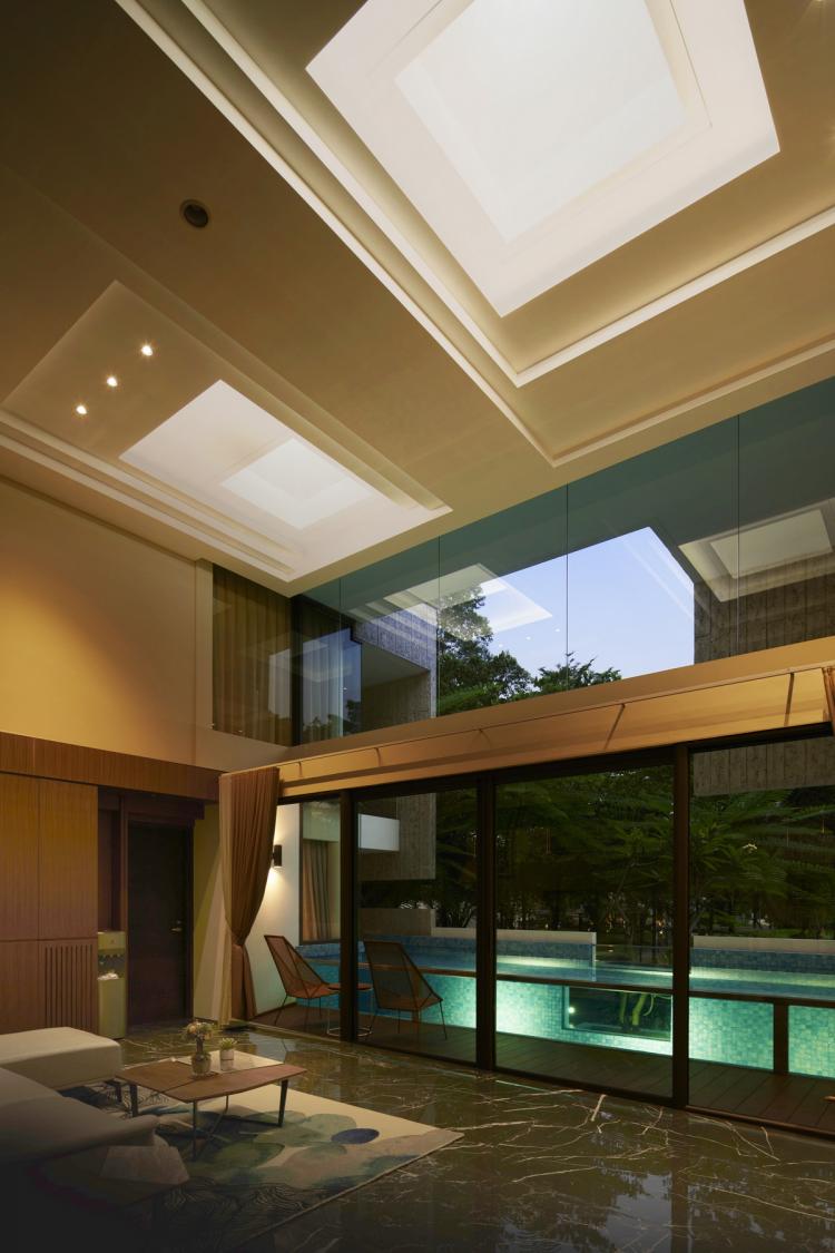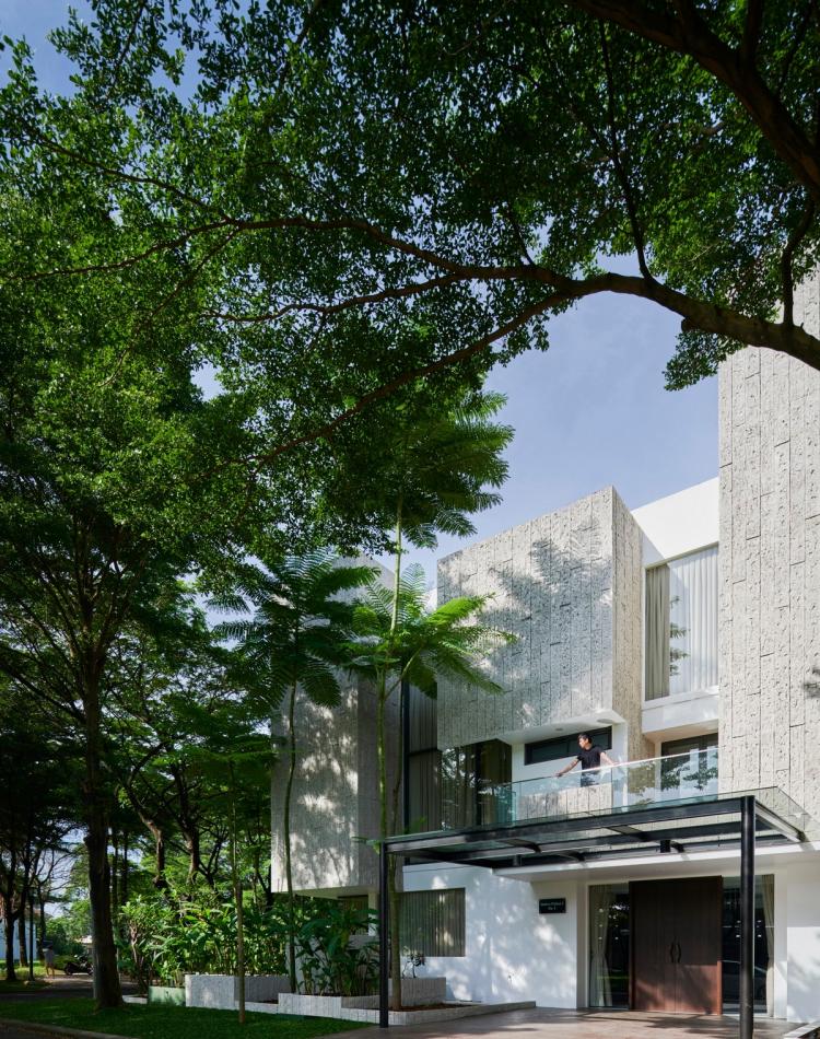 阳台和游泳池被嵌入建筑主体而不是向外突出。这种空间减法使建筑物在入口处投下一片阴影,并为使用者提供了一个全景视角去欣赏郁郁葱葱的花园,同时考虑了隐私性,巧妙地规避了从室外投来的视线。