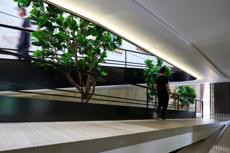 项目中多个相互交叠的间隔空间保证了自然通风的顺利进行。平缓的坡道被用于竖向交通和室内自然通风。坡道底部的倒映池与顶部三角形铝制天窗为空气流动提供了条件,因此该区域也被用做一个通风井,自然气流保证了热空气24小时连续不断地放出水汽并通过顶部的天窗排出。