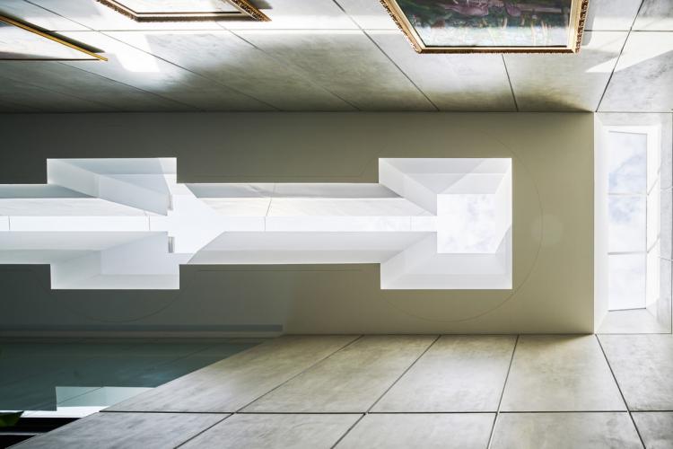 房屋入口向坡道开放。太阳东升西落带来的光影效果在坡道上得到体现,创造出全年24小时不断变化的空间体验,坡道在被用作家庭画廊的同时也指向一个非正式起居空间。它直接通向游泳池,并将对面花园的景色引入室内。起居室也被作为两个主卧之间的空间屏障,起到缓冲中和的作用。
