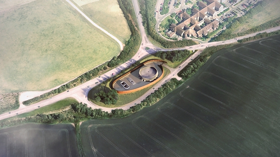 一个装饰性的屋顶和弯曲的耐候钢墙将包围阿默沙姆通风井(Amersham Vent Shaft) ,这是格里姆肖(Grimshaw)为英国高速二号铁路(High Speed Two)设计的。
