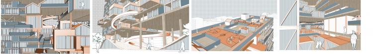 居民可以按照自己的兴趣和功能需求使用共享空间,可以在底层草坡公园娱乐,可以在空中连廊漫步,也可以在顶层乐园健身,在不同的区域参与不同的生活性活动。