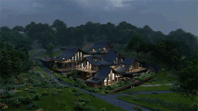 大院:大面积的露天影院、活动广场置于入口平地,其余公共客厅随地势高差划分的台地而分散于每两到三个体量之间。