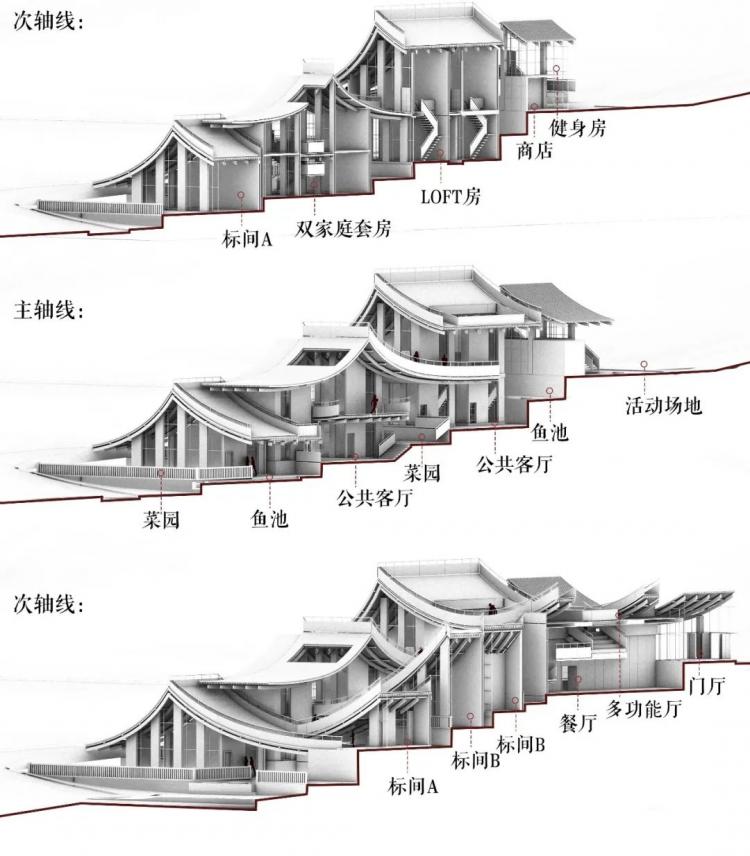 场地及建筑空间顺应地势高差划分出三条轴线,菜园、鱼池、公共客厅等开放性场所作为主轴线,大标间、小标间、LOFT间、双家庭套间以及门厅、餐厅、多功能厅、商店、健身房居于两侧连成次轴线。