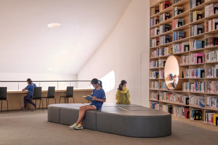 图书剧场位于聚落校园重要的一角,靠近一条城市主干道和一条古运河的交汇处,从远处就可以看到它醒目的蓝色和倾斜的屋顶。一个个有机形态的天窗、舷窗和圆洞,组合成生动的表情,将这个K12学校的天真与童趣引入城市界面。