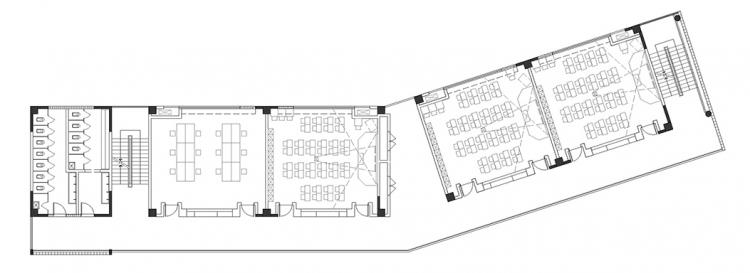 教学楼分为三栋长形体量,标准层均为四间教室俩俩成组,转折处打开与南向的室外走廊连接成一体,扩大走廊空间也提供了视线北望的机会。