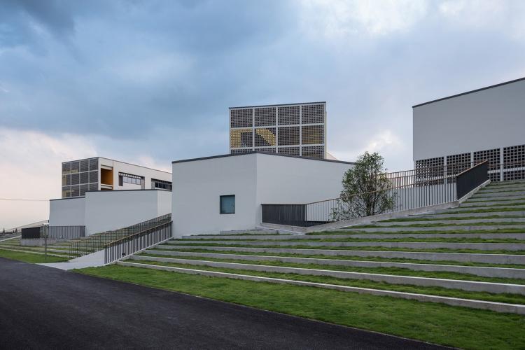 操场旁边草坡形式的地台,从初始“坡”的概念演变为阶梯式,以植草台阶结合混凝土收边,既保有坡地的形式,又满足运动场看台的功能,是一种地景式的基础设施。