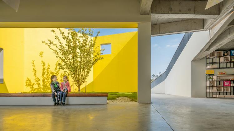 小学处于上海与江苏的边界处,设计挖掘传统江南水乡的地貌特色,以院落空间布局的组织方式,使区域原有空间特质得以延续。建筑体量的后退释放、地势的自然过渡、建筑形态的高低变化均是从大自然空间中获得灵感。与此同时也打开了城市空间层次展示的一扇窗,课间时,运动场、坡地草坪、平台、南向走廊等空间都是孩子们自由活动的场地。