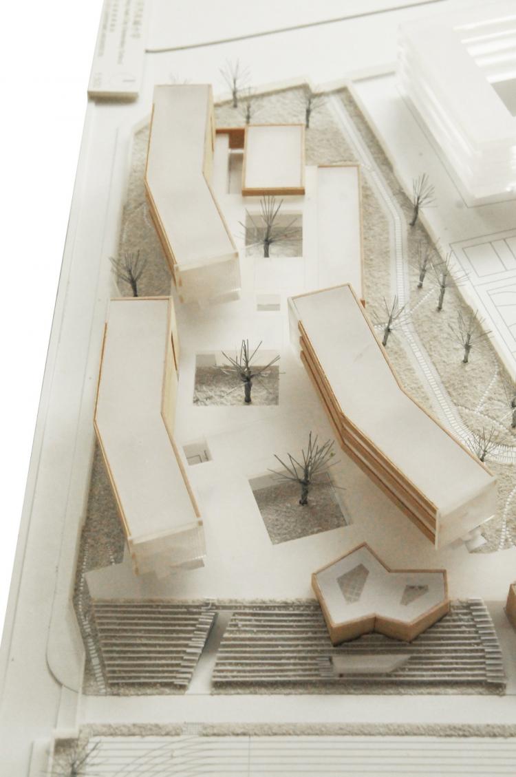 在教学楼形态的处理上,设计强调进深感和沿河立面的反光效果。每一栋教学楼都根据规范要求和红线做了体量上的转折。