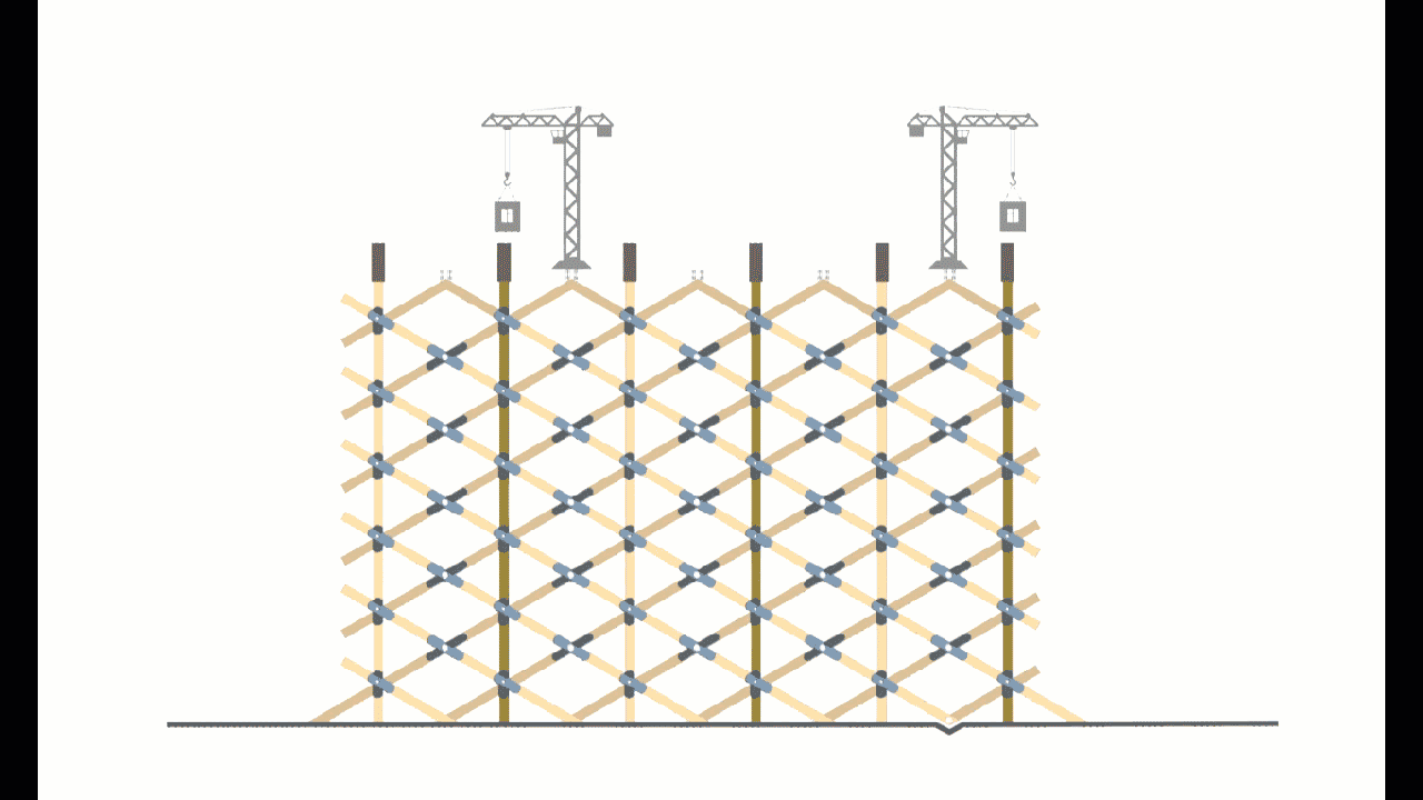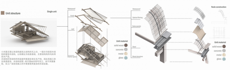 我们在外轮廓用木头作为结构支撑,在结构外连接运输轨道,便于运输日常补给物品以及提供外出的交通,屋顶支撑出的帷幔,可以用来太阳能发电。在一些自然灾害来临时,寓所快速进入“暂停模式”帷幔能够临时满足居民们的用电需求,轨道能够快速提供居民们的日常补给。