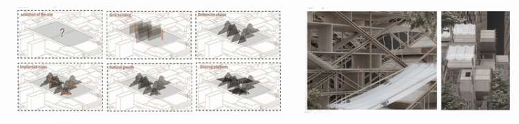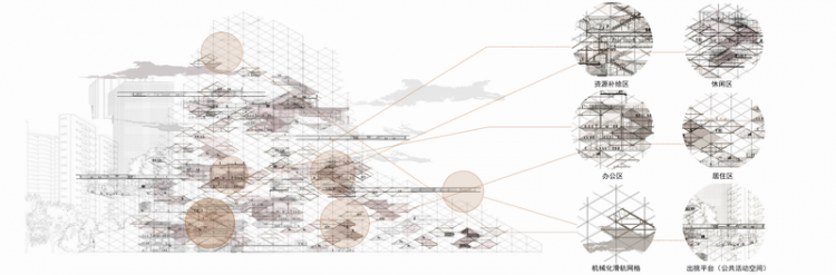 我们的设计更像是让人们与自己的住宅共同成长的方案,与传统的寓所不同,“山云以城”是偏二维化的,建筑拔地而起,我们希望可以用另一种方式将寓所整合起来。建筑包含运输系统,用单元的方式建造住宅,单元大小不同,可以替换和变化。有封闭的公共区域。