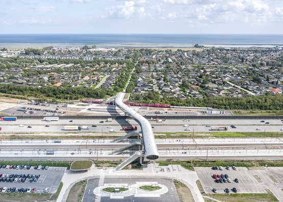 这两家工作室将火车站设计成一座蛇形的人行天桥,连接着两条重要的铁路线——一条高速铁路线和一条郊区铁路线——并在丹麦最繁忙的高速公路上方运行。