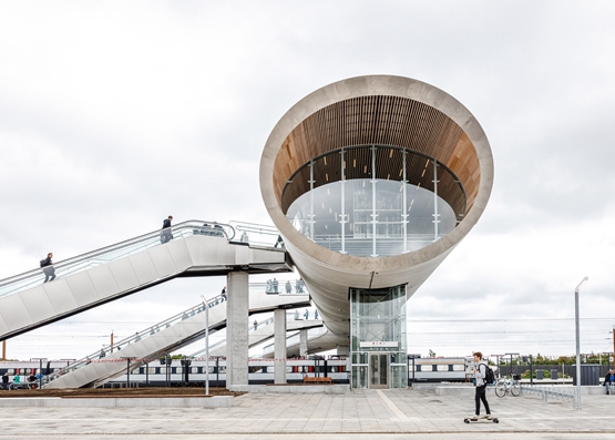 科格-诺德车站 (Koge Nord Station)跨越两条铁路线和八条高速公路,由科贝工作室(Cobe)和迪斯-威特林工作室(Dissing+Weitling)设计。这个车站连接通往哥本哈根的一条新的高速铁路。