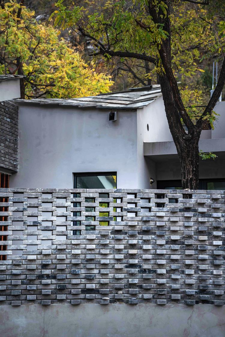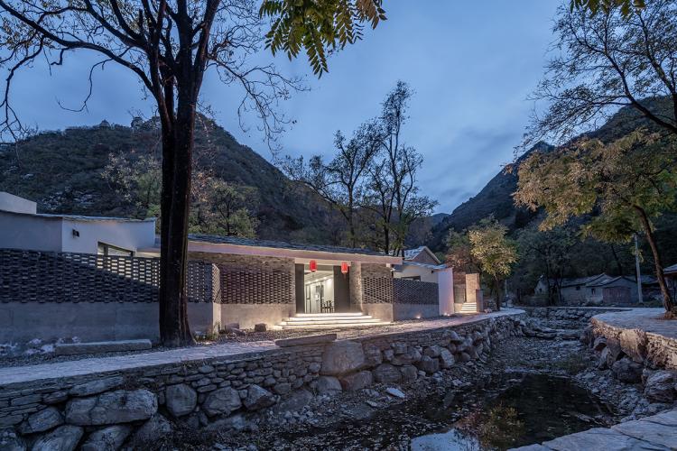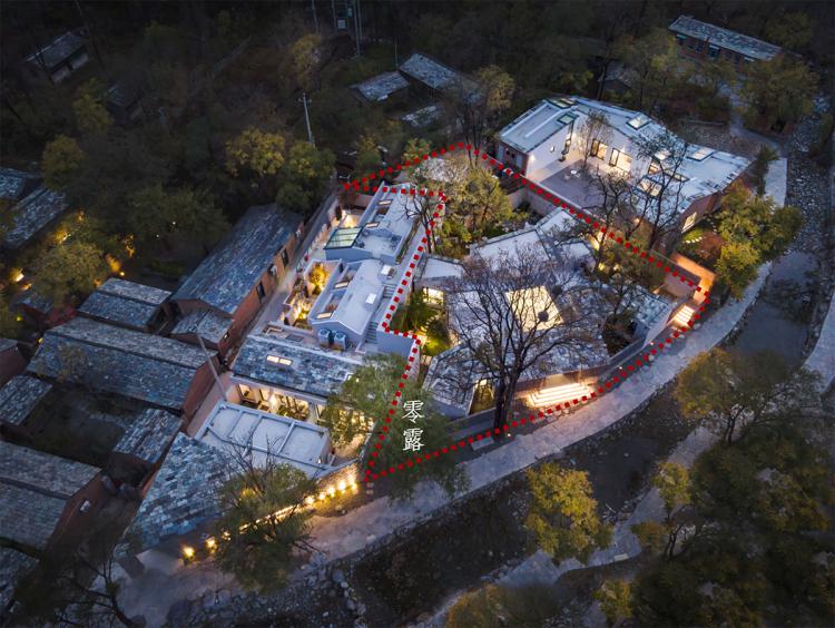 “零露”位于黄山店传统村落之中,传统民居院落所传达出的空间形式,材料,尺度,色彩等均是千百年来栖息在这里的居民的生活方式,精神风貌特质的显性转译。亲人尺度的入口处坡屋顶,精神性的“四水归堂”,中轴线上的空间序列性,当地材料的回收利用均在当代民宿中被重新诠释。