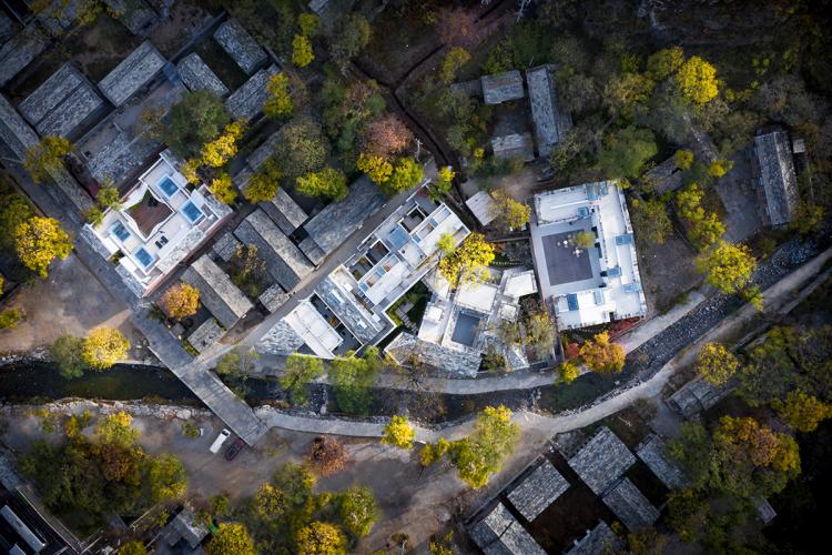 由SUNLAY LAB主持设计的“零露”组团位于一处不规则形状的基地。几座民宿背山面河,组合共生构成民宿聚落,形成了隐于村落,对话峰岭的新民宿居住体验。