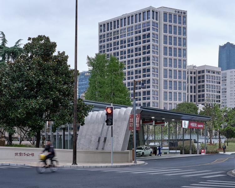其原址为1948年建成的中国第一个国营的加油站。原有加油站的模式为经典的超市办公加上钢结构罩棚的模式,缺乏公共性和通透性;总体动线组织上,加油的机动车流线同公众流线之间缺乏适当的分流;功能上,绝佳的景观资源无法被单一的超市与加油功能所利用;文化资源在原有的模式化的加油站上也难以有与众不同的体现。因此我们在设计中的重点在于如何对于原有的加油站的模式有所突破,形成一个公共通透、动线合宜、功能复合、当代语境的基础设施加油站建筑。