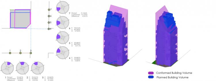 利用凹凸不平的雕塑性表面和人性化的规则形状的的办公空间来最大化增加建筑体量,建筑的南侧和东侧在8层以上受到严格的高度限制并要后退,这是日本市区特有的规定,是为了保证面向狭窄街道的居住环境的阳光和日照而订立的。然而,由于应急楼梯的轮廓塑造出的雕塑般的建筑体量,保证了周围环境的充足采光,使建筑高度从8层增加到9层,实现了最大化的开发体量。尽管这座建筑在外观上看起来效率不高,但实际上这种造型有助于 "保证最大化的可用空间",这对办公用户来说是最重要的好处。