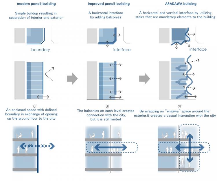 在东京,有很多建筑的商业寿命即将结束,需要重建。我们认为,如果每栋建筑都能注重与周边环境的关系,就有可能使城市变得更有吸引力和活力。无论规模大小,许多建筑都必须解决 "最大和最佳的可出租面积与紧急情况下的安全之间的平衡"。"它们还必须解决 "以多样和活跃的方式融入城市",作为与当地社区密切联系的独一无二的建筑。
