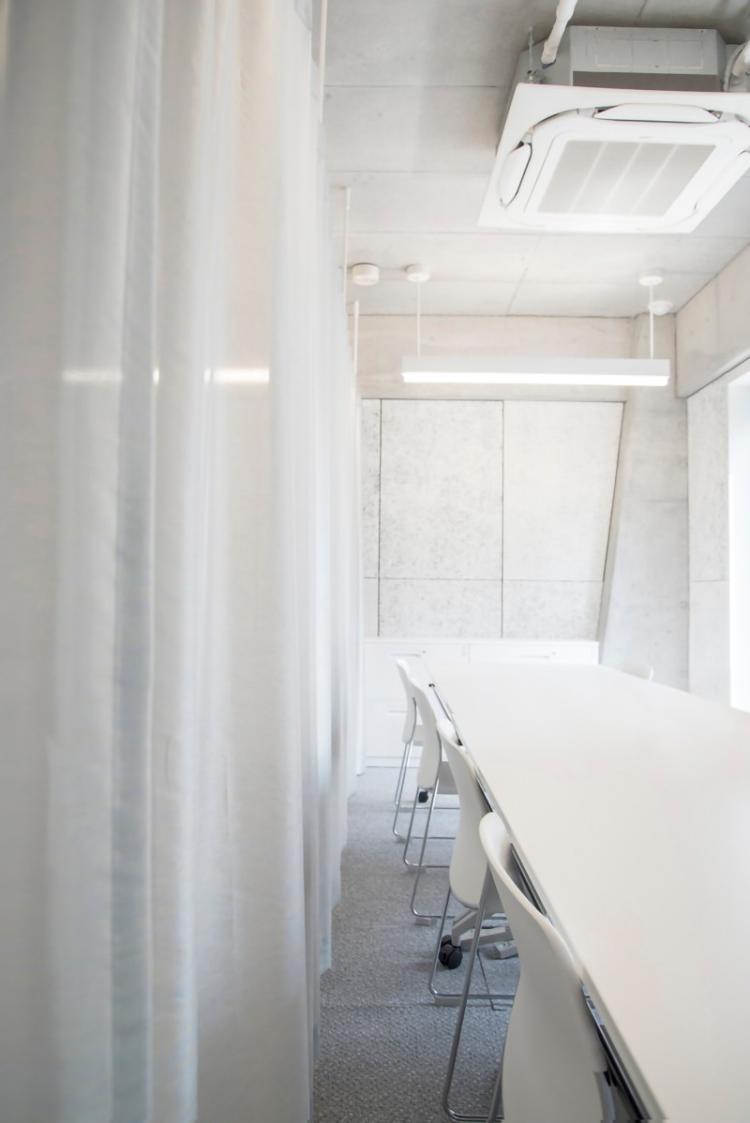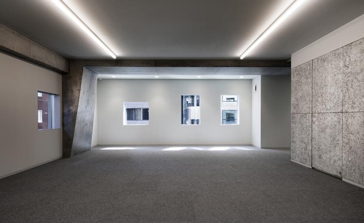 为了让办公空间感觉更宽敞,业主办公楼层(6F~8F)清水混凝土天花板利用现成的上灯和下灯组件组合开发的新型线性系统进行照明,使整个天花板看起来明亮。通过组合现有的灯具和部件,而不是定制灯具,只需更换故障部件,就可以方便维修和保养。出租的办公楼层(2F~5F)提供吊顶,但线性照明灯具直接安装在天花板上,提供与上面的楼层类似的明亮表面。