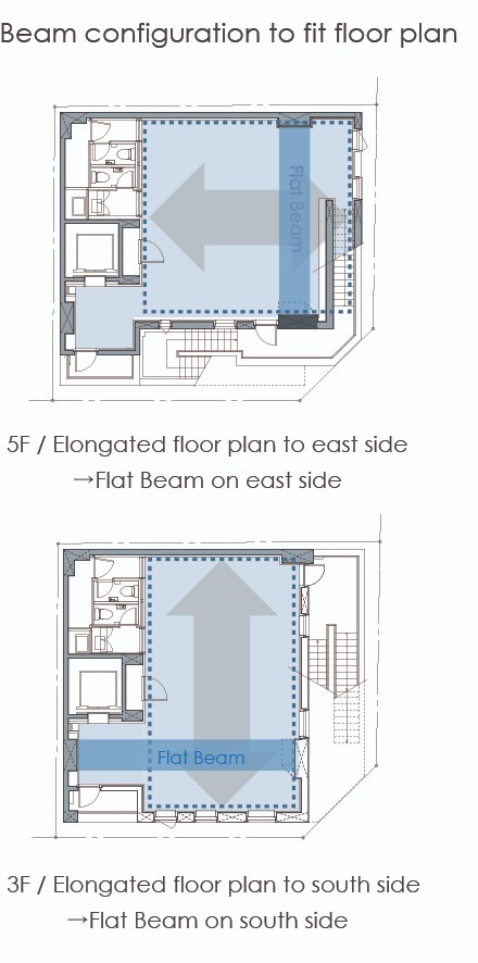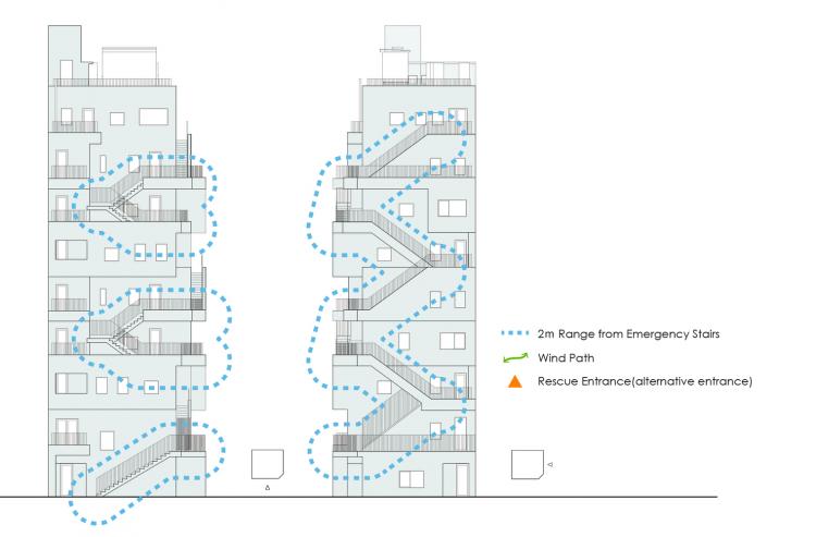 由紧急疏散楼梯和阳台形成的动态建筑体量为下面各层的开口提供了遮挡效果。因此,间接的自然光通过小开口进入,而不需要百叶窗。此外,小开间提供的框景视野唤起了人们对外部世界的期待感,就像在看一件艺术品。同时,每层楼的不同景观和与城市联系产生的不同感觉,会让人产生一种与整个城市风貌掩映交织在一起的意向。遵照日本建筑标准法,紧急楼梯2米范围内只适用面积最大1平方米的防火固定窗。同时,考虑到救援入口(替代入口)以及结构设计中对承重墙的限制,需要保证最大数量的有效可用窗户。