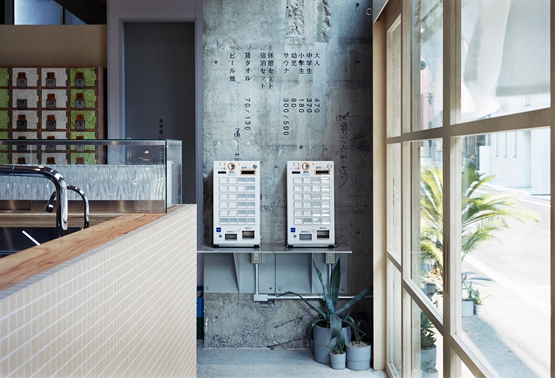 田中一郎(Iichiro Tanaka)设计了“诺伦”(noren)——传统的布料分体式窗帘——将男女更衣室分开。田中选择了感叹号Oi!向隔着墙的男人和女人的问候致意。品牌和标牌由高桥广子(Takahashi Hiroko)负责。