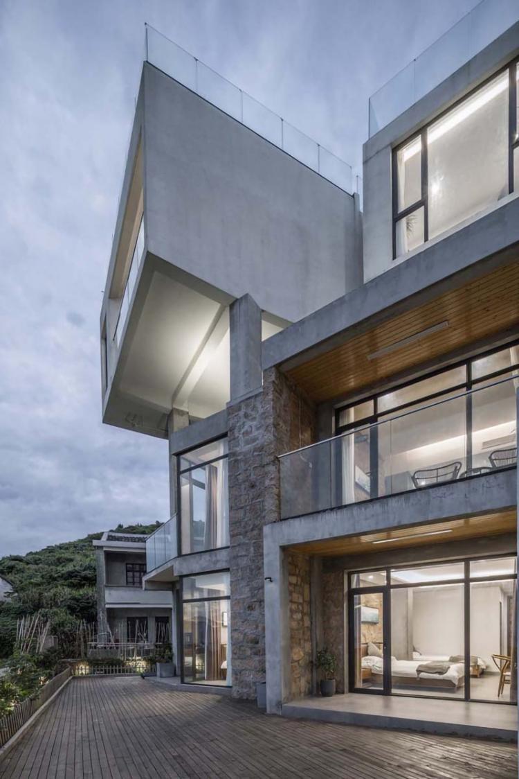 本案最大程度地保留了老建筑的石墙、木楼板和木屋架、灰瓦的坡屋顶,营造朴素原生的居住空间。同时,在一层入口插入白色体块,使原本分离的公共空间串联而具有纵深感;在大堂中央设置室外中庭,调节采光和气氛;通过框架结构,在三层架空多个白色体块,并对应景观使其方向做了扭转变化;三层以上形成屋顶平台,以满足无边泡池、露天剧场、聚会空间等配套功能。